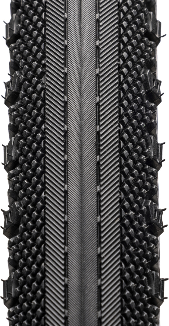 Das semi-slick Profil startet mit einer glatten Mitte für minimalen Rollwiderstand auf ebenem Untergrund. Es geht über in zunehmend griffigere Zonen für optimalen Seitenhalt und endet mit stabilen Stollen für sicheres Kurvenverhalten.