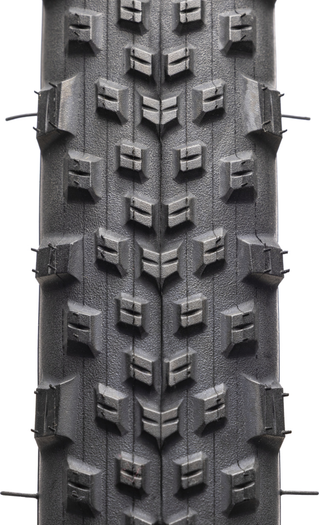 Das Allwetter-Design bringt dir hohe Seitenstollen fu?r maximalen Grip in Kurven auf losem oder steinigem Untergrund, abgeschraegte Mittelstollen fu?r geringen Rollwiderstand und viel Platz zwischen den Stollen, damit sich kein Schlamm festsetzt.