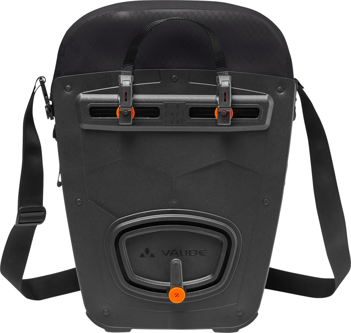 Die Fahrradtaschen für klimafreundliche Radfahrer: Die Aqua Back Pro wird aus robustem, PVC-freiem, vollständig recyceltem Material am deutschen VAUDE-Standort in Tettnang hergestellt und ist ein langlebiger Begleiter für viele Radtouren. Das Frontmaterial besteht aus recyceltem Polyester; die Seitenwangen bestehen aus recyceltem Polyamid. Die Tasche ist mit reflektierenden Elementen bedruckt, absolut wasserdicht und kann durch den Deckelverschluss schnell geöffnet und wieder verschlossen werden. Eine zusätzliche Innentasche sorgt für mehr Übersichtlichkeit und 24 Liter Volumen je Tasche für ausreichend Stauraum. Die umweltfreundliche Rückenplatte besteht vollständig aus recyceltem Material. Hierbei wird in einem innovativen Recyclingverfahren neuer, langlebiger Rohstoff erzeugt. Die dadurch äusserst stabile Rückenplatte wurde mit dem leicht bedienbaren QMR 2.0-System ausgestattet, damit die Tasche mit einem Handgriff an- und abgemacht werden kann. Die Befestigung ist über einfach bedienbare Handrädchen justierbar und passt somit auf jeden Gepäckträger bis 16 mm Rohrdurchmesser. Mit dem abschliessbaren QMR 2.0 Befestigungssystem (z. B. Abus-Schloss 145/10, nicht im Lieferumfang enthalten) lassen sich die Taschen sicher am Fahrrad verriegeln. Das VAUDE Green Shape-Label steht für ein umweltfreundliches, funktionelles Produkt aus nachhaltigen Materialien. Zudem ist dieses Produkt klimaneutral: Die Emissionen aus Materialien, Herstellungsprozess und Versand wurden ganzheitlich ermittelt und systematisch reduziert. Aktuell nicht vermeidbare Emissionen wurden vollständig über die unabhängige Non-Profit-Organisation ?myclimate? kompensiert. Lieferumfang: 1 Paar Taschen