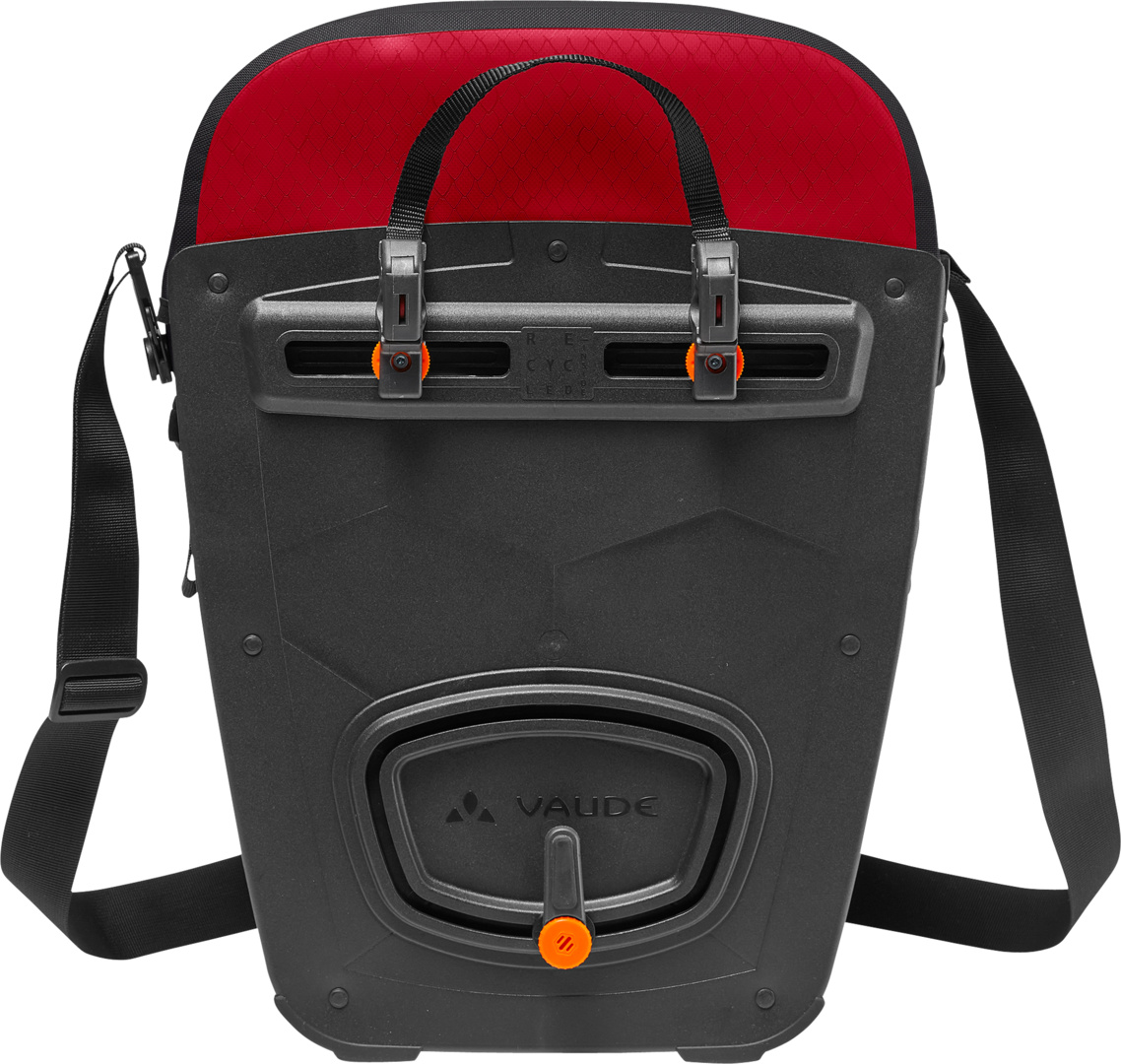 Die Fahrradtaschen für klimafreundliche Radfahrer: Die Aqua Back Pro wird aus robustem, PVC-freiem, vollständig recyceltem Material am deutschen VAUDE-Standort in Tettnang hergestellt und ist ein langlebiger Begleiter für viele Radtouren. Das Frontmaterial besteht aus recyceltem Polyester; die Seitenwangen bestehen aus recyceltem Polyamid. Die Tasche ist mit reflektierenden Elementen bedruckt, absolut wasserdicht und kann durch den Deckelverschluss schnell geöffnet und wieder verschlossen werden. Eine zusätzliche Innentasche sorgt für mehr Übersichtlichkeit und 24 Liter Volumen je Tasche für ausreichend Stauraum. Die umweltfreundliche Rückenplatte besteht vollständig aus recyceltem Material. Hierbei wird in einem innovativen Recyclingverfahren neuer, langlebiger Rohstoff erzeugt. Die dadurch äusserst stabile Rückenplatte wurde mit dem leicht bedienbaren QMR 2.0-System ausgestattet, damit die Tasche mit einem Handgriff an- und abgemacht werden kann. Die Befestigung ist über einfach bedienbare Handrädchen justierbar und passt somit auf jeden Gepäckträger bis 16 mm Rohrdurchmesser. Mit dem abschliessbaren QMR 2.0 Befestigungssystem (z. B. Abus-Schloss 145/10, nicht im Lieferumfang enthalten) lassen sich die Taschen sicher am Fahrrad verriegeln. Das VAUDE Green Shape-Label steht für ein umweltfreundliches, funktionelles Produkt aus nachhaltigen Materialien. Zudem ist dieses Produkt klimaneutral: Die Emissionen aus Materialien, Herstellungsprozess und Versand wurden ganzheitlich ermittelt und systematisch reduziert. Aktuell nicht vermeidbare Emissionen wurden vollständig über die unabhängige Non-Profit-Organisation ?myclimate? kompensiert. Lieferumfang: 1 Paar Taschen