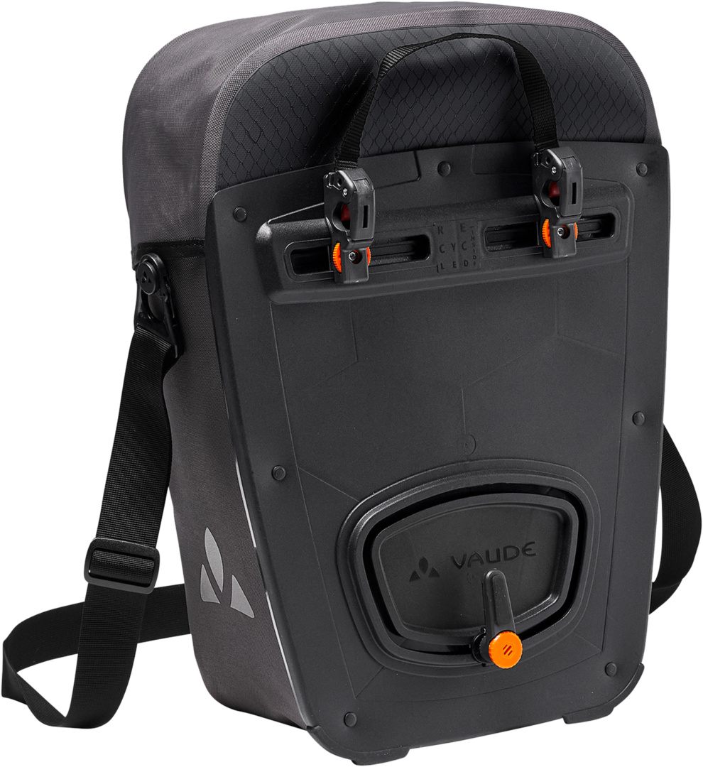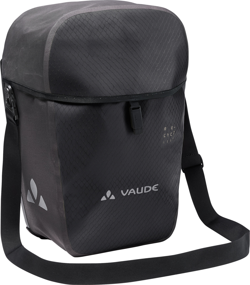 Die Fahrradtasche für klimafreundliche Pendler: Die Aqua Commute wird aus robustem, PVC-freiem Planenmaterial am deutschen VAUDE-Standort in Tettnang hergestellt und ist ein langlebiger Begleiter auf dem Arbeitsweg. Die Tasche ist mit reflektierenden Elementen bedruckt, absolut wasserdicht verschweisst und kann durch den Deckelverschluss schnell geöffnet und wieder verschlossen werden. Die Innenausstattung ist für den Büroalltag zugeschnitten: Das gepolsterte Laptopfach, Stifthalter und diverse Einsteck- und Reissverschlussfächer helfen, den Inhalt übersichtlich zu orden. Der abnehmbare Schultergurt hilft beim Transport zu Fuss und durch die ausgesteifte Seitenwange kann die Tasche bequem und kippsicher abgestellt werden. Die umweltfreundliche Rückenplatte besteht vollständig aus recyceltem Material: Hierbei wird in einem innovativen Recyclingverfahren neuer, langlebiger Rohstoff erzeugt. Die dadurch äusserst stabile Rückenplatte wurde mit dem leicht bedienbaren QMR 2.0-System ausgestattet, damit die Tasche mit einem Handgriff an- und abgemacht werden kann. Die Befestigung ist über einfach bedienbare Handrädchen justierbar und passt somit auf jeden Gepäckträger bis 16 mm Rohrdurchmesser. Mit dem abschliessbaren QMR 2.0 Befestigungssystem (z. B. Abus-Schloss 145/10, nicht im Lieferumfang enthalten) lassen sich die Taschen sicher am Fahrrad verriegeln. Dieses Produkt ist klimaneutral: Die Emissionen aus Materialien, Herstellungsprozess und Versand wurden ganzheitlich ermittelt und systematisch reduziert. Aktuell nicht vermeidbare Emissionen wurden vollständig über die unabhängige Non-Profit-Organisation ?myclimate? kompensiert. Lieferumfang: 1 Tasche