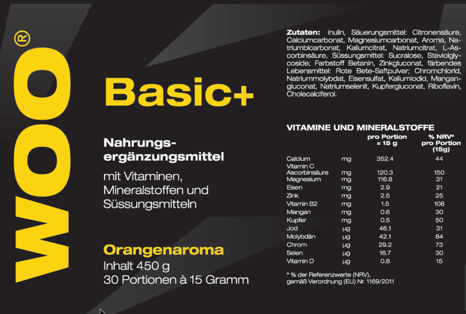Was zeichnet die Inhaltsstoffe von WOO Basic + aus:– Calcium, Eisen, Jod, Kupfer, Magnesium, Mangan und Vitamin C trägt zu einem normalen Energiestoffwechsel bei– Kupfer, Mangan, Selen und Zink trägt dazu bei, die Zellen vor oxidativem Stress zu schützen– Eisen und Magnesium trägt zur Verringerung von Müdigkeit und Ermüdung bei– Calcium trägt zu einer normalen Signalübertragung zwischen den Nervenzellen bei– Calcium trägt zu einer normalen Muskelfunktion bei– Zink trägt zu einem normalen Säure-Basen-Stoffwechsel bei– Magnesium trägt zum Elektrolytgleichgewicht bei– Biotin, Niacin, Pantothensäure, Thiamin und die Vitamine B2, B6, B12 und C tragen zu einem normalen Energiestoffwechsel bei