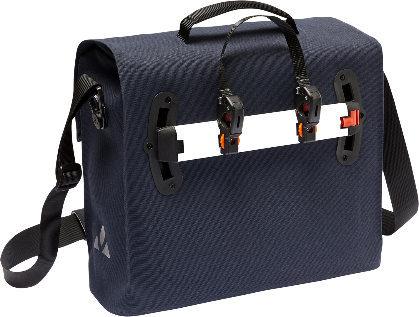 Die Aktentasche fürs Fahrrad. Die mittelgrosse Hinterradtasche Bayreuth M im Aktentaschenformat wird aus robustem, zu 100 % recyceltem Polyester-Material mit textiler Optik hergestellt, ist wasserdicht verschweisst und komplett PVC-frei. Der 13″ Laptop verschwindet gut geschützt im gepolsterten Fach neben sonstigen A4-Unterlagen, die im Hauptfach Platz finden. Das helle Innenmaterial sorgt für gute Übersicht: Ein Schlüsselhalter, ein gepolstertes Handyfach, Stifthalter und ein Loop zum Einstecken einer Trinkflasche runden die Innenausstattung ab. Über die verstellbare Plug and Ride-Befestigungsschiene wird die Tasche am Fahrrad-Gepäckträger (bis 16 mm Durchmesser) mit den QMR-Haken montiert und abgenommen, was schnell und einfach von der Hand geht. Mit einem kleinen Bügelschloss (z. B. VAUDE TSA Combination Lock II, nicht im Lieferumfang enthalten) kann die Radtasche direkt am QMR-Haken verriegelt werden. Die kleinen „Füsschen“ am Boden sorgen für guten Stand, per Tragegriff oder mit gut gepolstertem Schulterträger kann die Tasche bequem zu Fuss transportiert werden. Reflektierende Elemente auf der Front und an den Seiten sorgen für erhöhte Sichtbarkeit. Die Fahrradtasche wird klimaneutral am VAUDE Firmensitz in Süddeutschland in Hochfrequenztechnik gefertigt, klares Design und hochwertige Made in Germany-Qualität inklusive. Die Emissionen aus Materialien, Herstellungsprozess und Versand wurden ganzheitlich ermittelt und systematisch reduziert. Aktuell nicht vermeidbare Emissionen wurden vollständig über die unabhängige Non-Profit-Organisation ?myclimate? kompensiert. Das VAUDE Green Shape-Label steht für ein umweltfreundliches, funktionelles Produkt aus nachhaltigen und bluesign® zertifizierten Materialien.