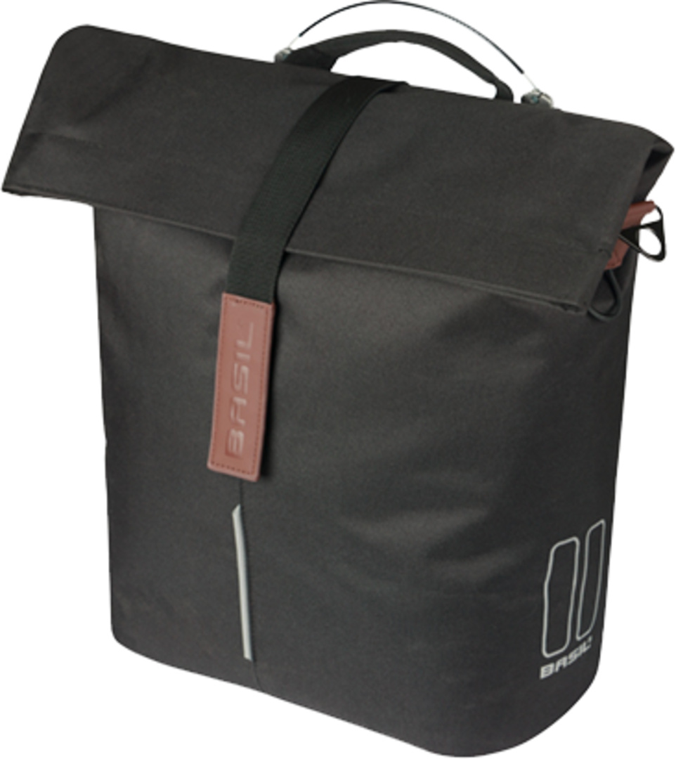 Der Basil City Shopper MIK Studs ist der Fahrrad-Shopper passt ideal zum schnellen Tempo der Stadt. Arbeit, Freunde, Feiern, auf den Markt gehen oder nach einer Yogastunde mal ganz du selbst sein. Der schwarze Shopper ist nicht zu schwer und nicht zu gross, aber bietet viel Platz (mit grossartigen 14 ? 16 Litern Inhalt) und ist stabil genug, um einige Einkäufe oder Sonstiges darin mitzunehmen. Der magnetische, wasserabwehrende Faltverschluss verhindert, dass Wasser in die Tasche gelangt. Die schwarze Tasche kannst du einfach am Gepäckträger befestigen oder an dem abnehmbaren Schulterriemen lässig über die Schulter hängen. An den Griffen aus veganem Leder lässt sich die Tasche angenehm tragen. Die Tasche hat ein Innenfach mit Reissverschluss und die integrierte Option zur Befestigung einer LED-Beleuchtung.