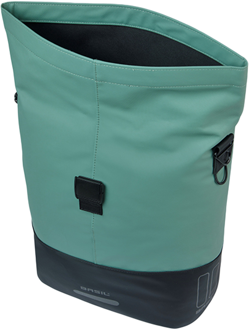 Mit einem Fassungsvermögen von 14 bis 16 Litern bietet die Tasche ausreichend Platz für alltägliche Dinge. Das Hauptfach wird mit einem wasserabweisenden Faltverschluss und einer Schnalle verschlossen. Im Inneren befindet sich ein Reissverschlussfach für Wertsachen. Der abnehmbare Schulterriemen und der Tragegriff stellen sicher, dass Sie die Tasche auch bequem zu Fuss transportieren können. Reflektierende Elemente und eine Schlaufe für eine LED-Beleuchtung sorgen unterwegs für zusätzliche Sicherheit.