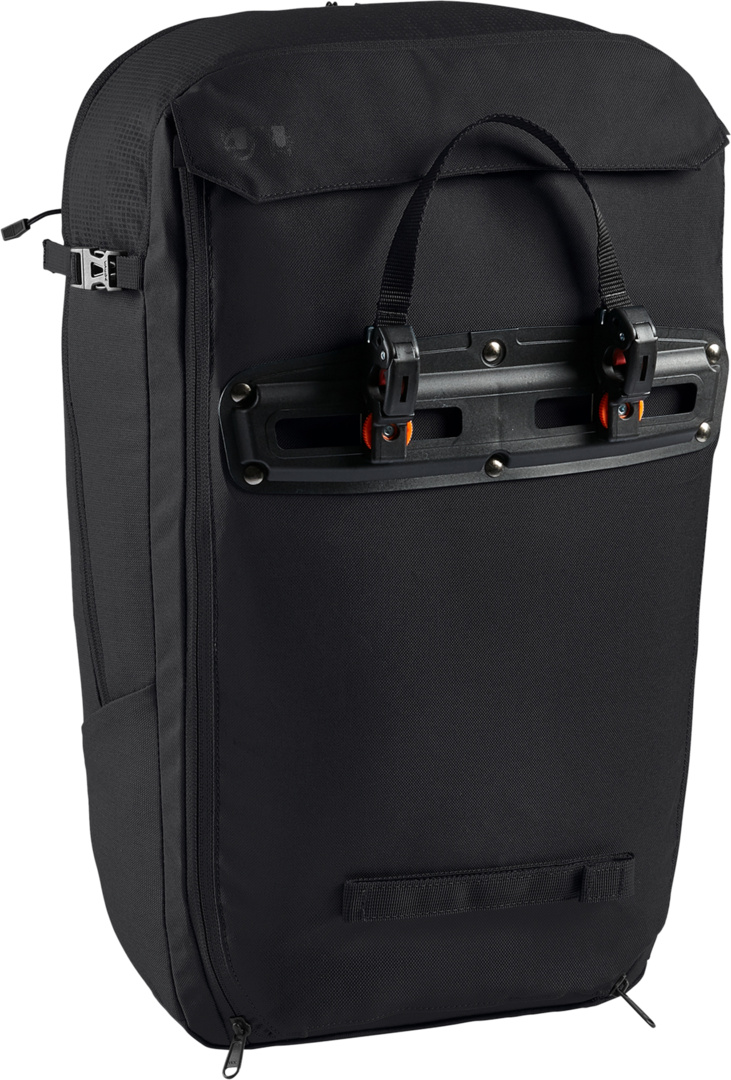 Rucksack oder Radtasche? Beides! Der Cycle 28 ist der ideale Begleiter für Commuter, die während der Fahrt einen sicheren Sitz der Tasche am Rad wünschen, sie dann aber in Bahn und Bus oder der Uni als Rucksack tragen möchten. Die Tasche wird über die mit einem Schloss absperrbaren QMR-Haken (z. B. Abus 145/20, nicht im Lieferumfang enthalten) am Gepäckträger befestigt und ist im Handumdrehen zum Rucksack umgebaut. Dazu werden die beiden vertikalen Reissverschlüsse geöffnet und das gesamte Befestigungssystem in einem mit Klett verschlossenen Fach verstaut. Die Umbaufunktion wird auf einem eingenähten, leicht entfernbaren Etikett in wenigen Schritten erläutert. Die clevere Rucksack-Radtaschen-Kombination bietet aber noch mehr. Im Vergleich zum kleineren Bruder Cycle 20 deutlich grösserem Hauptfach findet neben DIN A4 Unterlagen, Trinkflasche und Brotzeit auch Wechselwäsche Platz. Ein separates, mit Reissverschluss verschlossenes, gepolstertes Fach nimmt Laptops bis 15,6? auf. Ein über die gesamte Front reichendes Fach öffnet diagonal und bietet einen Netzorganizer für Handy, Schlüssel und Geldbeutel. Auf diesem Fach befindet sich zusätzlich eine flache Netztasche für das schnelle Verstauen von Zeitschriften oder nasser Kleidung. Zwei seitliche Kompressionsriemen, ein Helmhalter sowie ansprechend ins Design integrierte reflektierende Elemente runden die Komfortausstattung ab. Das Hauptmaterial des Cycle 20 besteht aus 50 % recyceltem Polyester, das Kontrastmaterial sogar zu 100 %. Unser Verwandlungskünstler ist mit EcoFinish PFC-frei wasserabweisend ausgerüstet. Das VAUDE Green Shape-Label steht für ein umweltfreundliches, funktionelles Produkt aus nachhaltigen Materialien.