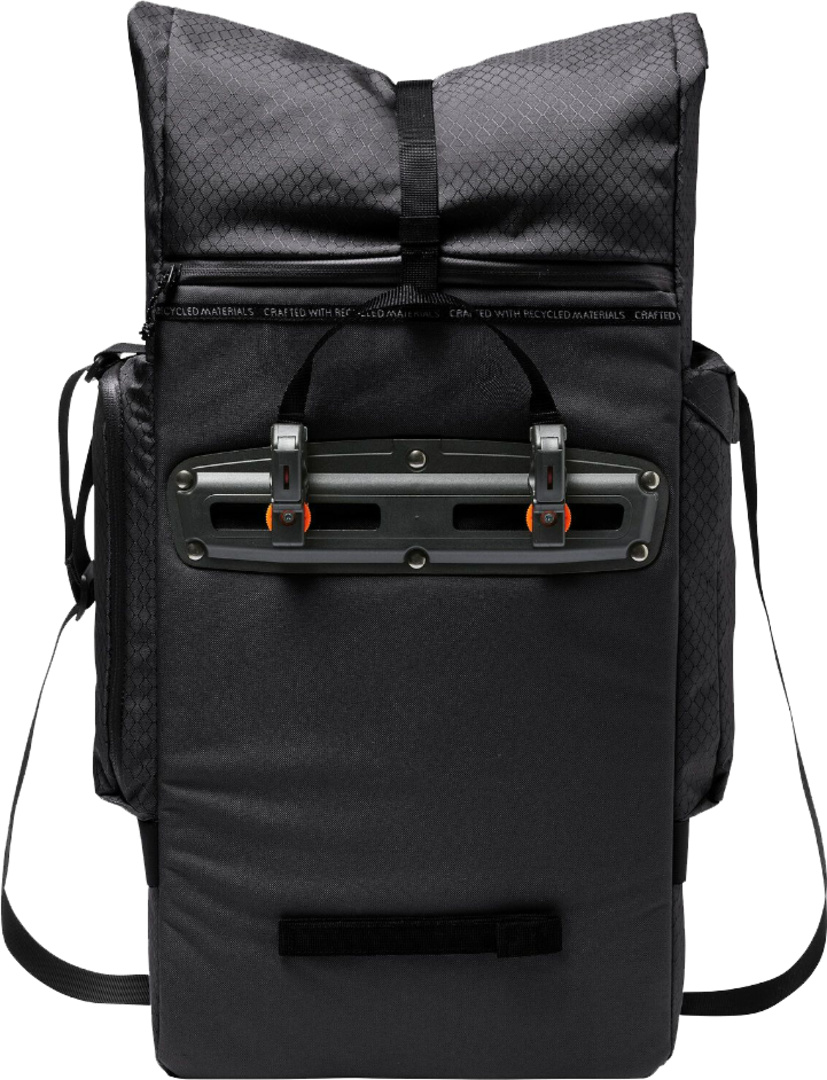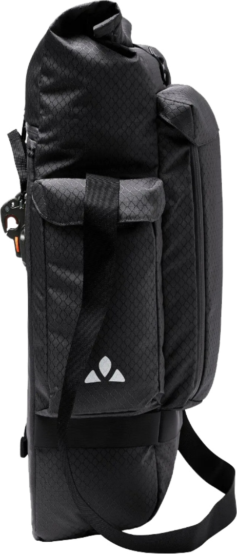 Einzelne Radtasche für urbane Biker*innen, die gerne aufs Auto verzichten! Die vielseitig einsetzbare Fahrradtasche im Messenger Style kommt mit Rolltop-Verschluss und wird über das QMR-Hakensystem (für runde Gepäckträgerrohre bis 16 mm) und den unteren Railhook leicht am Gepäckträger befestigt. Die Haken können mit einem kleinen Schloss (z. B. Abus 145/20, nicht im Lieferumfang enthalten) direkt am Haken gesichert werden. Eine Vielzahl an Taschen macht übersichtliche Organisation möglich: Die geräumige Radtasche nimmt mit 27 l Volumen alle Dinge des Alltags von Arbeitsmaterial über Wechsel- bis hin zu Sportsachen auf. Auf das grosse Laptopfach für 15,6″ Geräte kann über einen Reissverschluss separat zugegriffen werden. Auf der Front findet sich ein zusätzliches Tabletfach mit weiteren Organizerfächern. 2 stabile, aufgesetzte Seitentaschen fassen Trinkflaschen oder eine Musikbox. Bei geöffnetem Rollverschluss können selbst grössere Einkäufe bequem transportiert werden. Eine integrierte Regenhülle und ein abnehmbarer Schultertragegurt sind obligatorisch. Ein unauffällig ins Design integriertes, reflektierendes Webband im unteren Drittel der Radtasche sorgt für gute Sichtbarkeit in der Dunkelheit. Dieses Produkt ist mit Eco Finish umweltfreundlich wasserabweisend ohne Fluorcarbone (PFC) hergestellt. Das VAUDE Green Shape-Label steht für ein umweltfreundliches, funktionelles Produkt aus nachhaltigen und bluesign® zertifizierten Materialien.