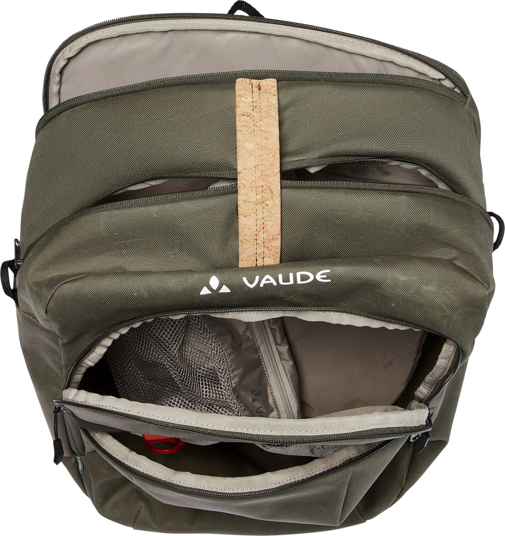 Die eBack Single Fahrradtasche aus recyceltem Polyester Material ist E-Bikers neuer Liebling! Sie verfügt über ein Ausstattungsspektrum, das sich speziell an Elektro-Radfahrer wendet und punktet neben der robusten Befestigung mit einem separaten Fach für Akkus, einem herausnehmbaren Wäschefach, einem Laptopfach für Geräte bis 15,6″ Grösse sowie mit mehreren Aussenfächern mit Reissverschluss, in denen alles Platz findet, was man unterwegs oder in der Arbeit benötigt – Unterlagen, Notizheft, Kladden. Mit dem abschliessbaren QMR 2.0 Befestigungssystem wird die eBack Single fest und sicher am Gepäckträger befestigt. Lieferumfang: 1 Tasche, die entweder links oder rechts am Gepäckträger befestigt werden kann. Das VAUDE Green Shape-Label steht für ein umweltfreundliches, funktionelles Produkt aus nachhaltigen Materialien.