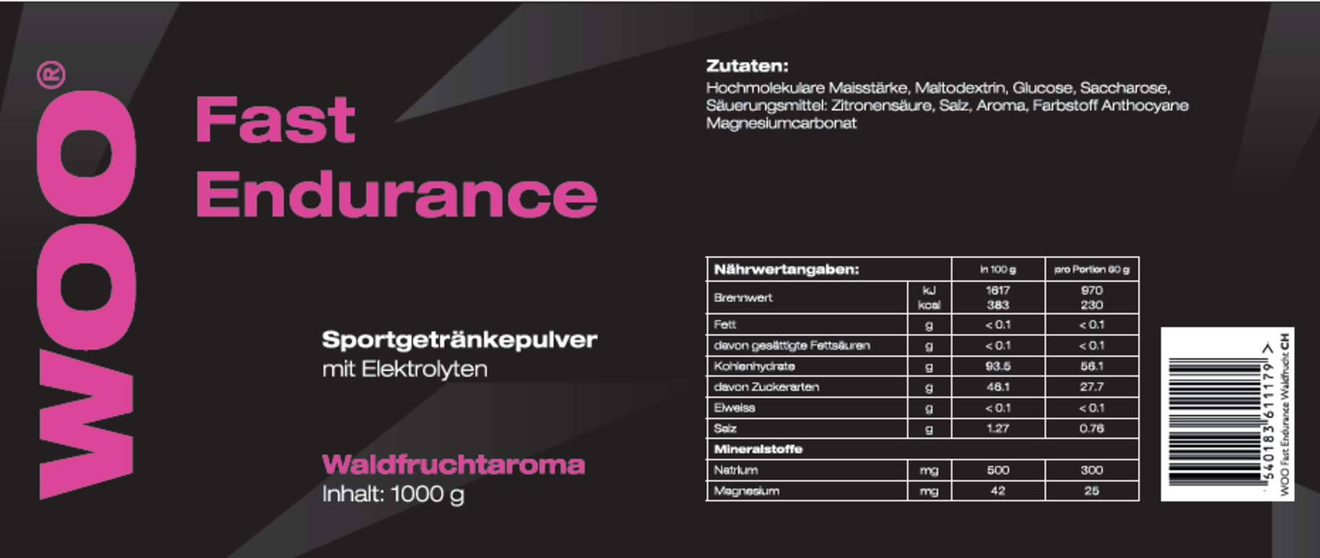Hochmolukolare Maistärke liefern deinem Körper sofort Energie.WOO® Fast Endurance ist ein ideales Sportgetränk für jede sportliche Aktivität. Die kurzkettigen Kohlenhydrate im WOO® Fast Endurance haben die Aufgabe den Körper bei sportlicher Belastung schnell wieder mit Energie zu versorgen. Dieser aufeinander abgestimmte Mix an Kohlenhydraten macht WOO® Fast Endurance zu einem hochwertigen Sportgetränk. Ein abruptes Abfallen des Blutzuckerspiegels oder gar ein Hungerast lässt sich wirkungsvoll vermeiden.