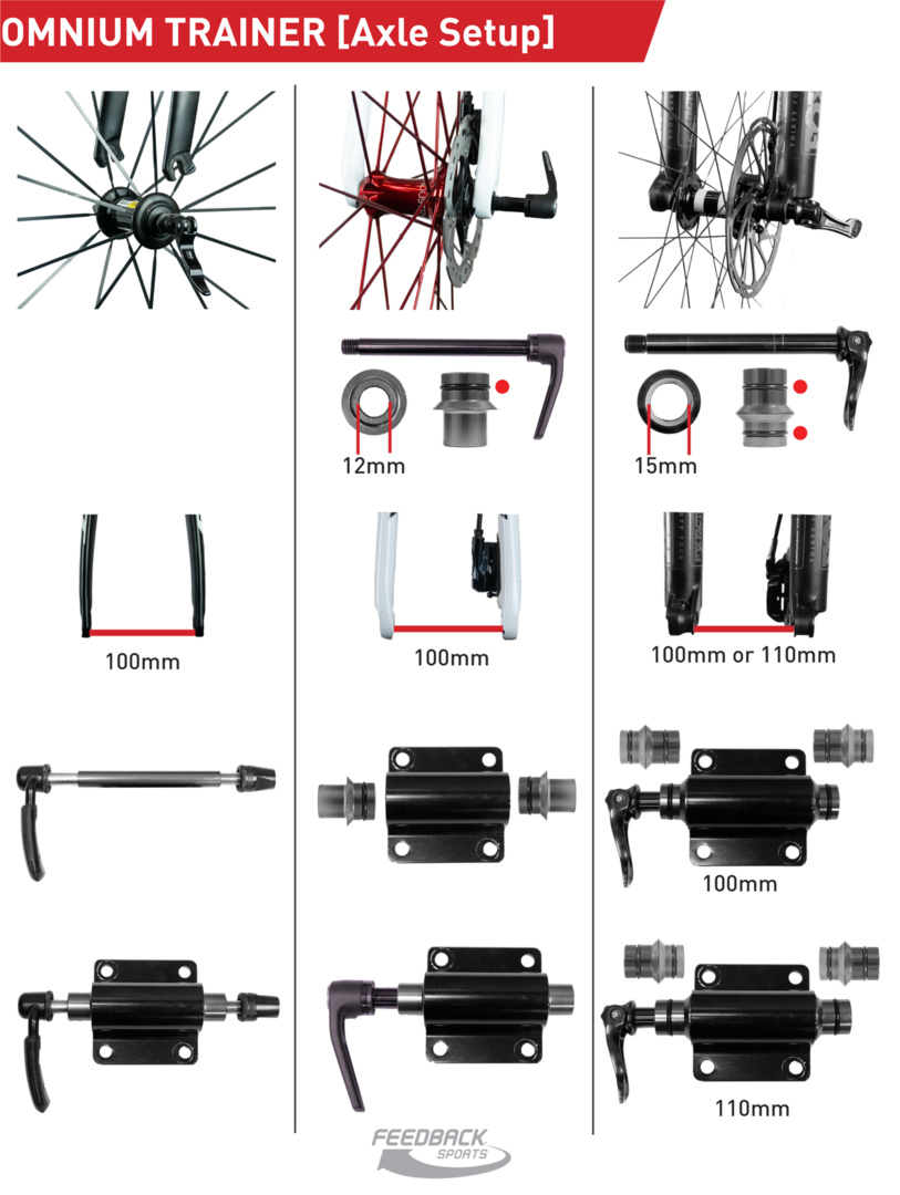 Separat erhältliche Adapter können 9 mm Schnellspanner, 100/12 mm Steckachse und 100/15 mm und 110/15 mm (Boost) aufnehmen, um alle aktuellen Standards für Strassen-, Cyclocross- und Mountainbike-Gabeln zu erfüllen.