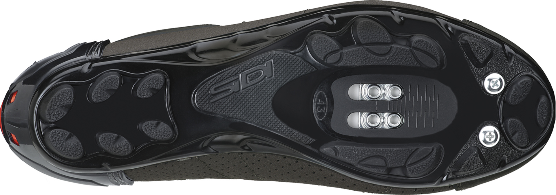 Wurde speziell für diese Spezialität entwickelt und kann mit zwei Zehenstollen an der Vorderseite ausgestattet werden, um die Traktion in schwierigen und schlammigen Bedingungen zu verbessern. Die Zehenstollen sind separat erhältlich.