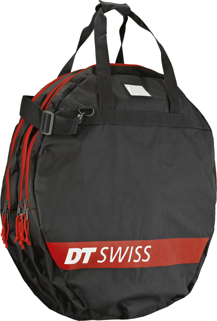 Die Laufradtasche von DT Swiss ist für drei 29″ Laufräder ohne Reifen. Mit Reifen, je nach Reifenbreite, passen zwei Laufräder in die Tasche. Die Tasche ist gepolstert und verfügt über ein Fach für ein Namenschild. Zwei Tragegriffe und ein breiter Tragriemen.