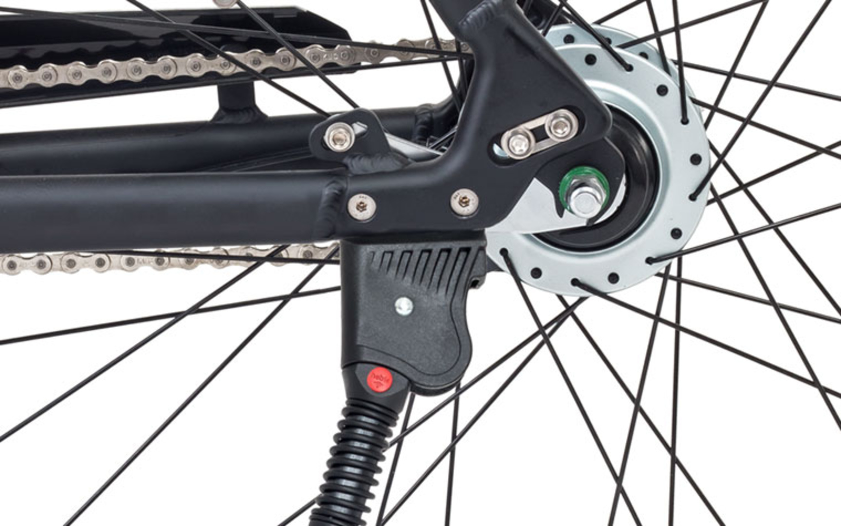 • Formschlüssige Fahrradständerlösung für Ausfallenden-Direktmontage KSA 40: spezielle Aufnahme an der Kettenstrebe, Lochabstand 40 mm
