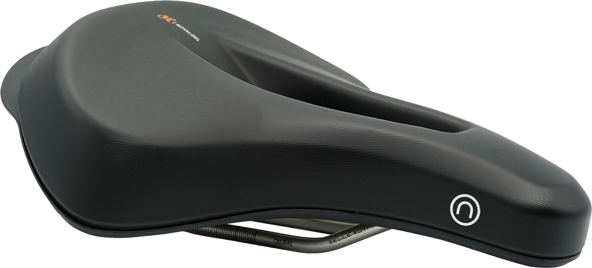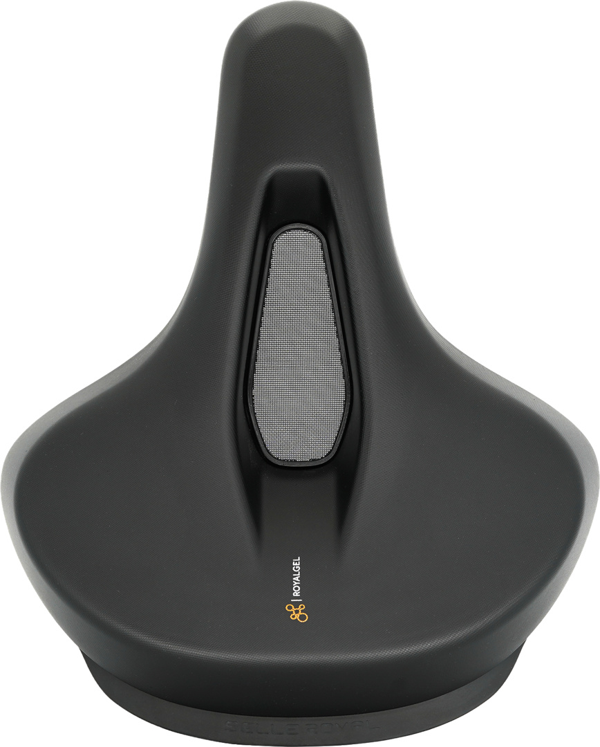 E-Bike-Sattel mit flexiblen Seiten für leichteres Pedalieren, erhöhtem Heck für stabilen Sitz, Soft-Touch-Griff für einfaches Manövrieren und mittigem Cut-Out zur Druckentlastung ? kombiniert mit Royalgel? für hohen Komfort auf Stadt- und Naturfahrten.