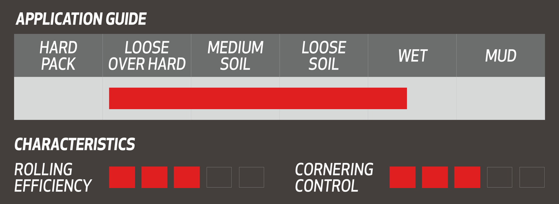 Angeschrägte Stollen sorgen für geringen Rollwiderstand und kontinuierlichen Bodenkontakt, während das offen gestaltete Profil beste Traktion in unterschiedlichstem Gelände bietet.