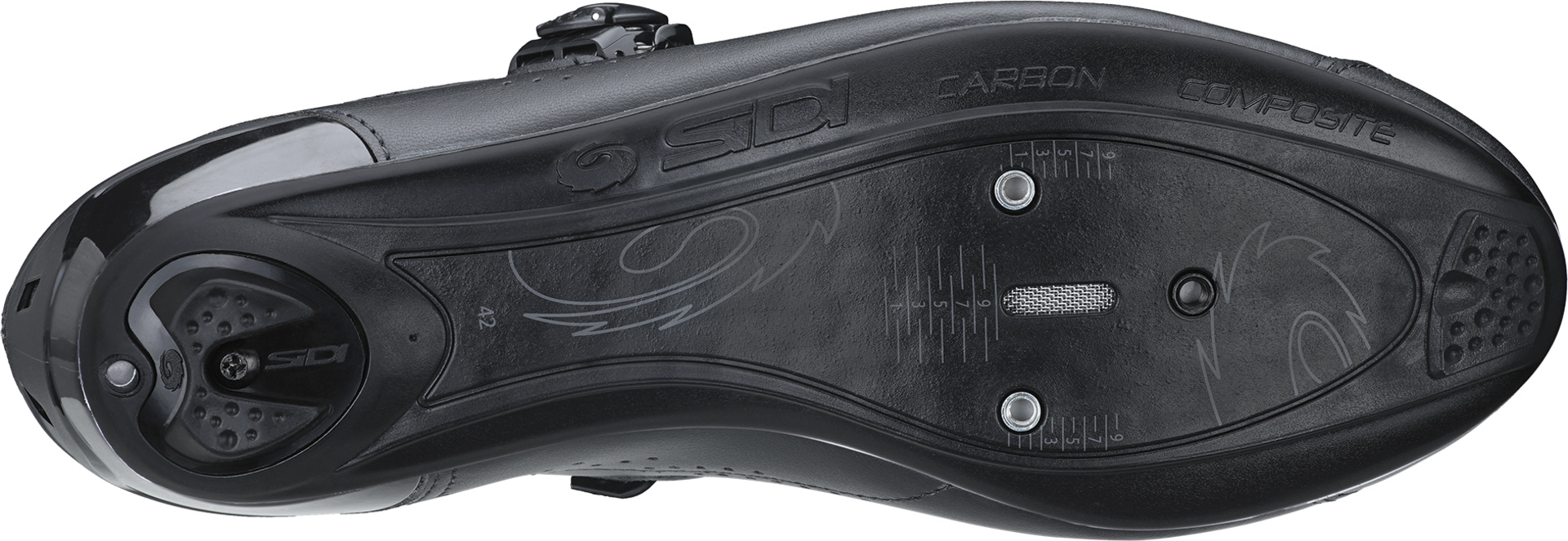 Die Carbon Composite Sole 20 besteht aus Nylon und eingespritzter Kohlefaser. Das Ergebnis ist eine leichte und steife Sohle, die auch bei wechselnden klimatischen Bedingungen oder im Laufe der Zeit ihre Eigenschaften nicht verliert. Der mittlere Teil der Sohle ist mit einer Millimeterskala versehen, um das korrekte Einsetzen der Stollen zu erleichtern. Eine auswechselbare, rutschfeste Einlage an der Ferse erleichtert das Gehen