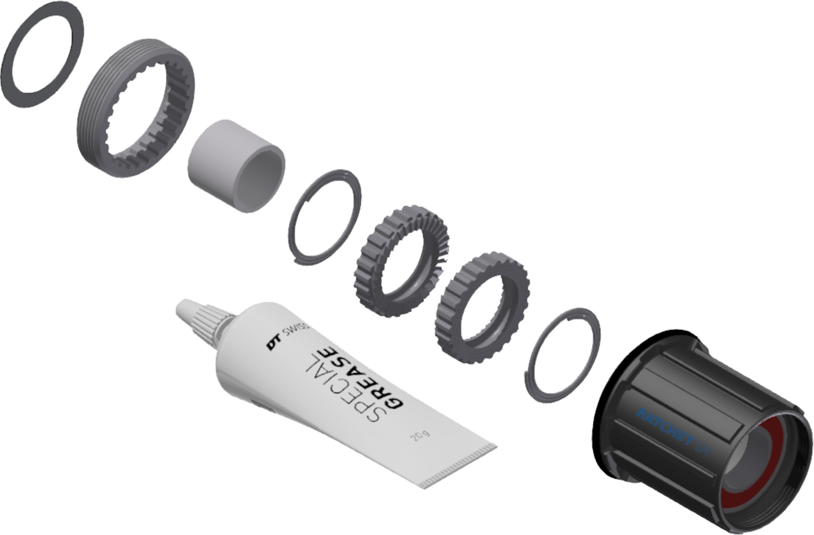 Upgrade Kit für den Umbau der DT Swiss 370er Naben mit 3 Pawl auf das Ratchet LN Zahnscheiben System. Bei gleichem Freilauf können die Endkappen übernommen werden.