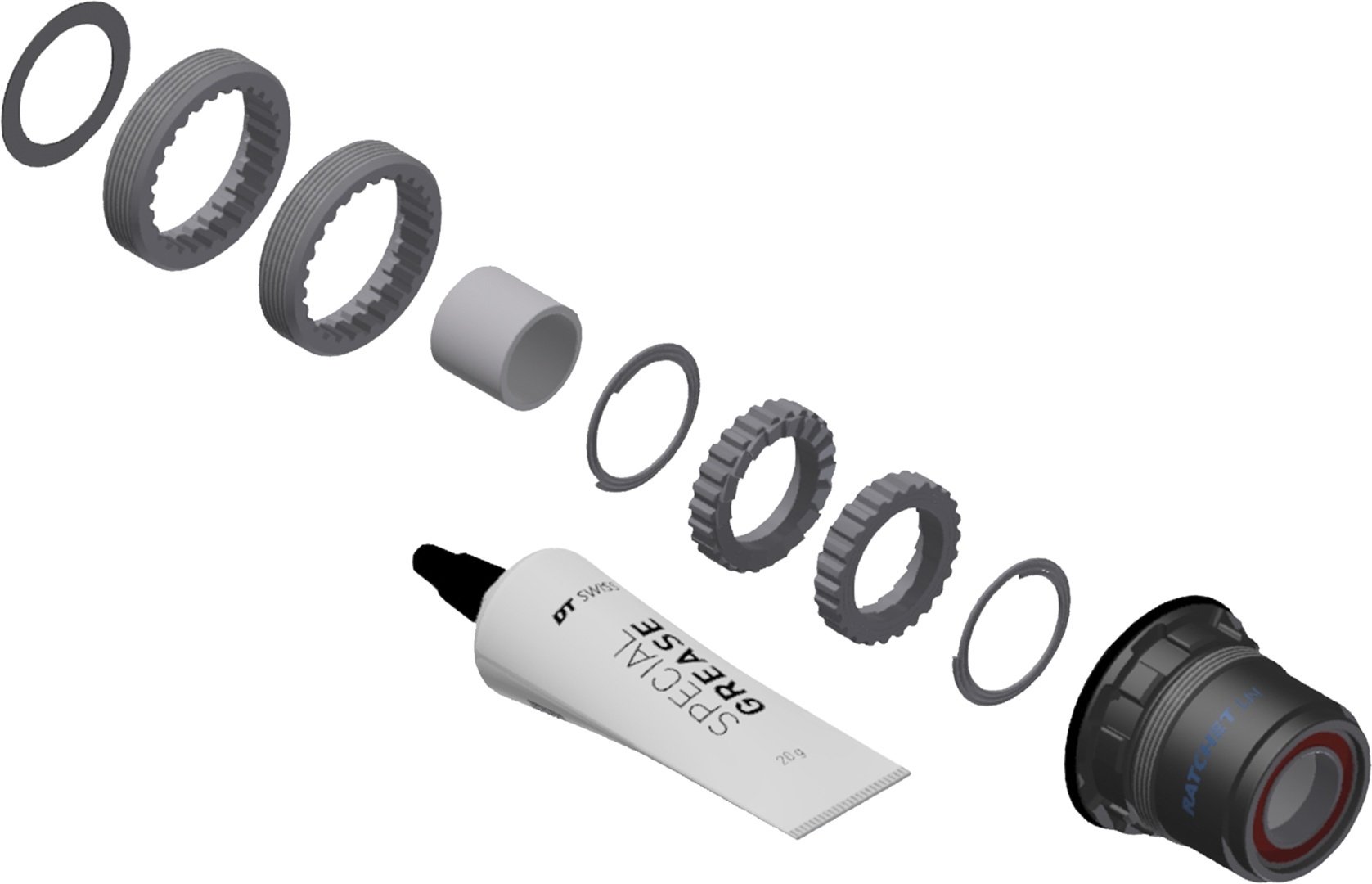 Upgrade Kit für den Umbau der DT Swiss 370er Naben mit 3 Pawl auf das Ratchet LN Zahnscheiben System. Bei gleichem Freilauf können die Endkappen übernommen werden.
