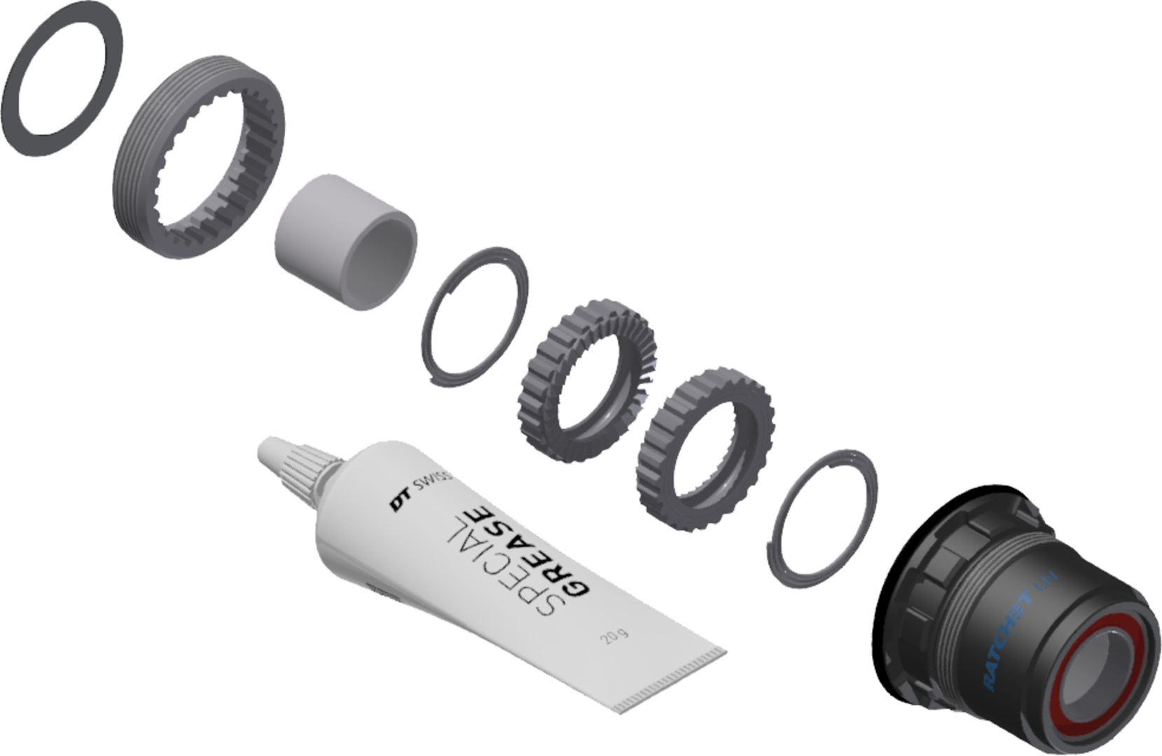 Upgrade Kit für den Umbau der DT Swiss 370er Naben mit 3 Pawl auf das Ratchet LN Zahnscheiben System. Bei gleichem Freilauf können die Endkappen übernommen werden.