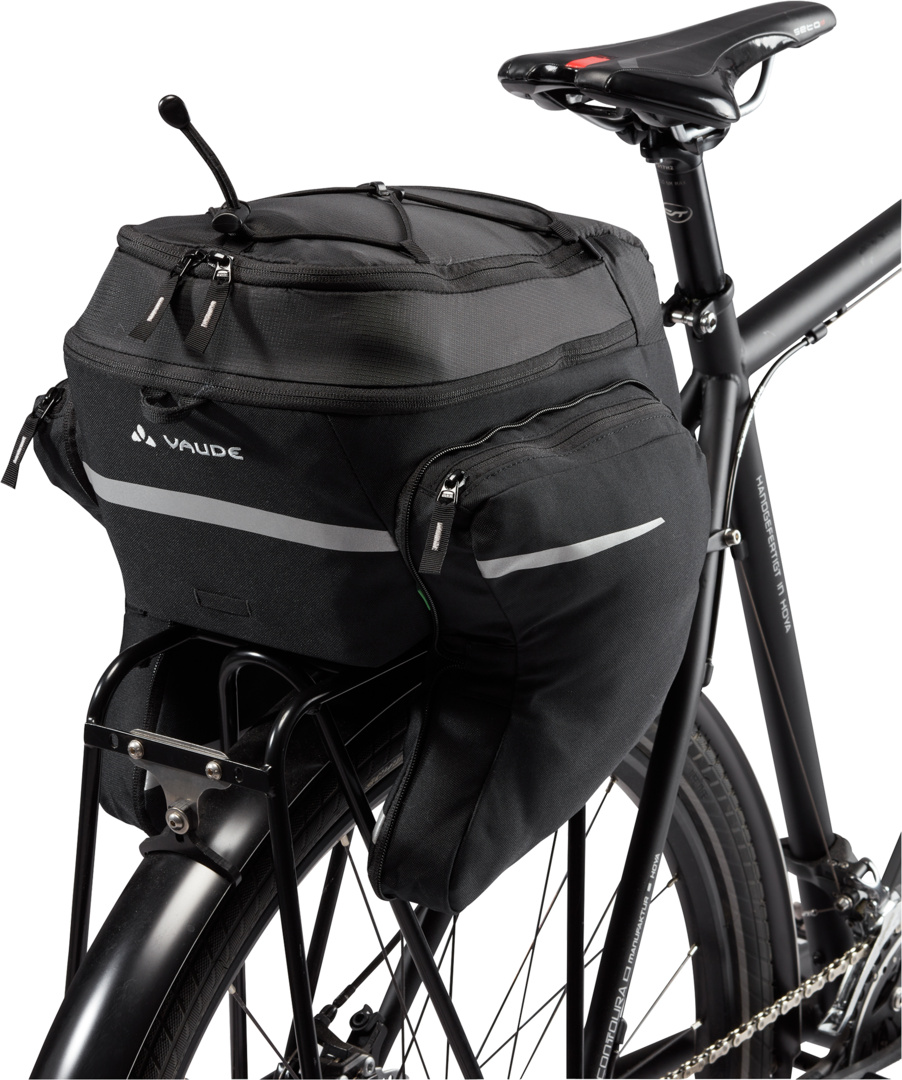 inneres Reissverschluss-Fach – Reissverschluss -Fach im Deckel – Erweiterungsbalg – Gepäckspinne – 2 seitliche Fächer – abnehmbarer Schultergurt – einfaches Befestigen und Abnehmen durch Adapter – Blinklichthalter – Volumenerweiterung – reflektierende Elemente