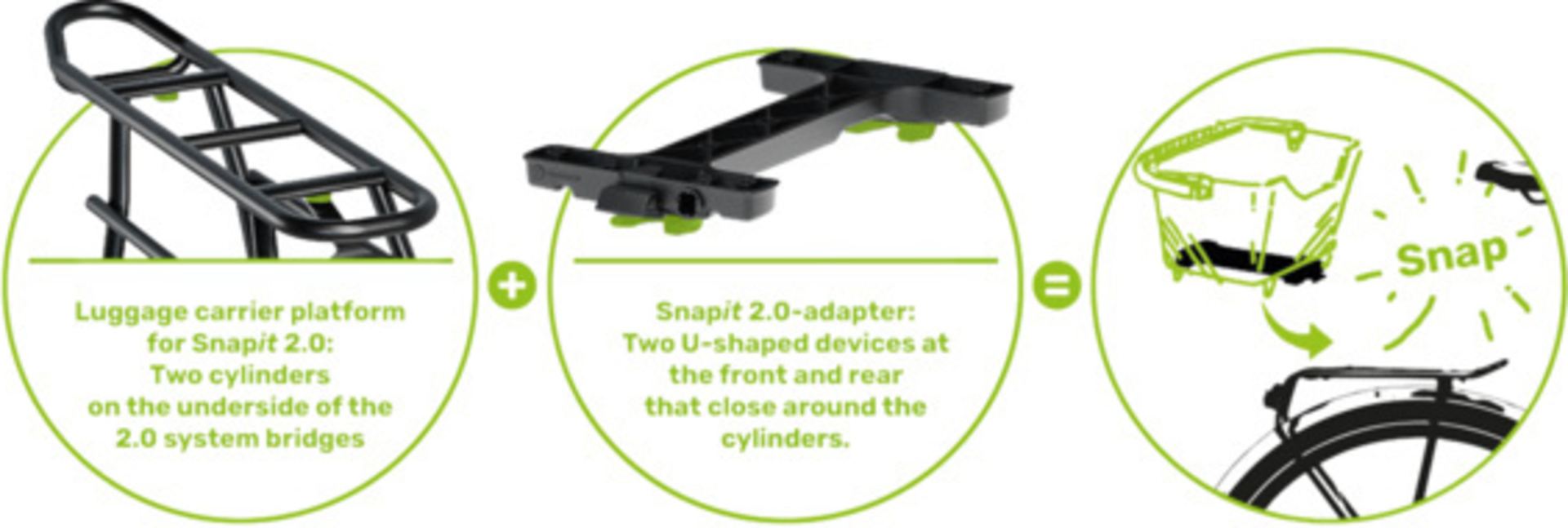 Mit SNAPIT 2.0 gelingt es, einfach und sicher eine Vielzahl an racktime-Zubehör zuverlässig auf dem racktime 2.0-Gepäckträger anzubringen. Diesen Luxus können nun auch alle erleben, die bislang noch keinen racktime 2.0-Gepäckträger besitzen. Schnell montiert verwandelt SNAPIT 2.0 CONNECT selbst die unscheinbarsten Gepäckträger zu Systemträgern, die man im Alltag nicht mehr missen möchte.