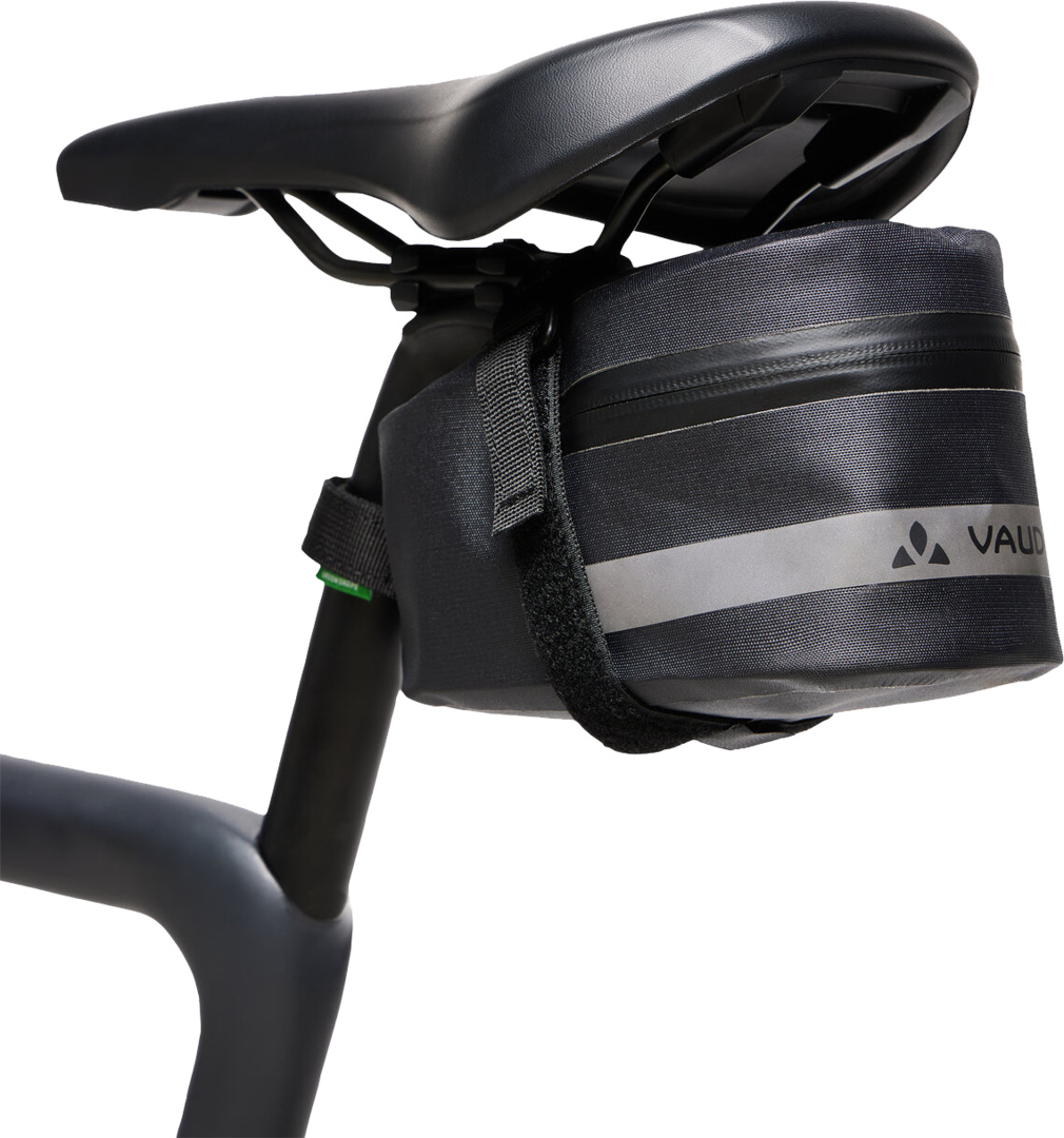 Die Satteltasche Tool Aqua XL ist wasserdicht verschweisst und bietet mit 1,7 Litern Volumen Rennrad- oder Gravelfahrern genug Platz für Schlüssel und eine klein verpackbare Regenjacke oder verwahrt sicher Werkzeug, Minipumpe, Reifen und Schloss. Die wasserdichte Satteltasche mit weiter Reissverschluss-Öffnung für schnellen Zugriff wird über ein optimiertes Klett-Befestigungssystem leicht und stabil unterm Sitz befestigt. Reflektierende Streifen und das reflektierende VAUDE Logo sowie eine Schlaufe zur Befestigung eines Rücklichtes runden die wasserdichte Satteltasche ab.