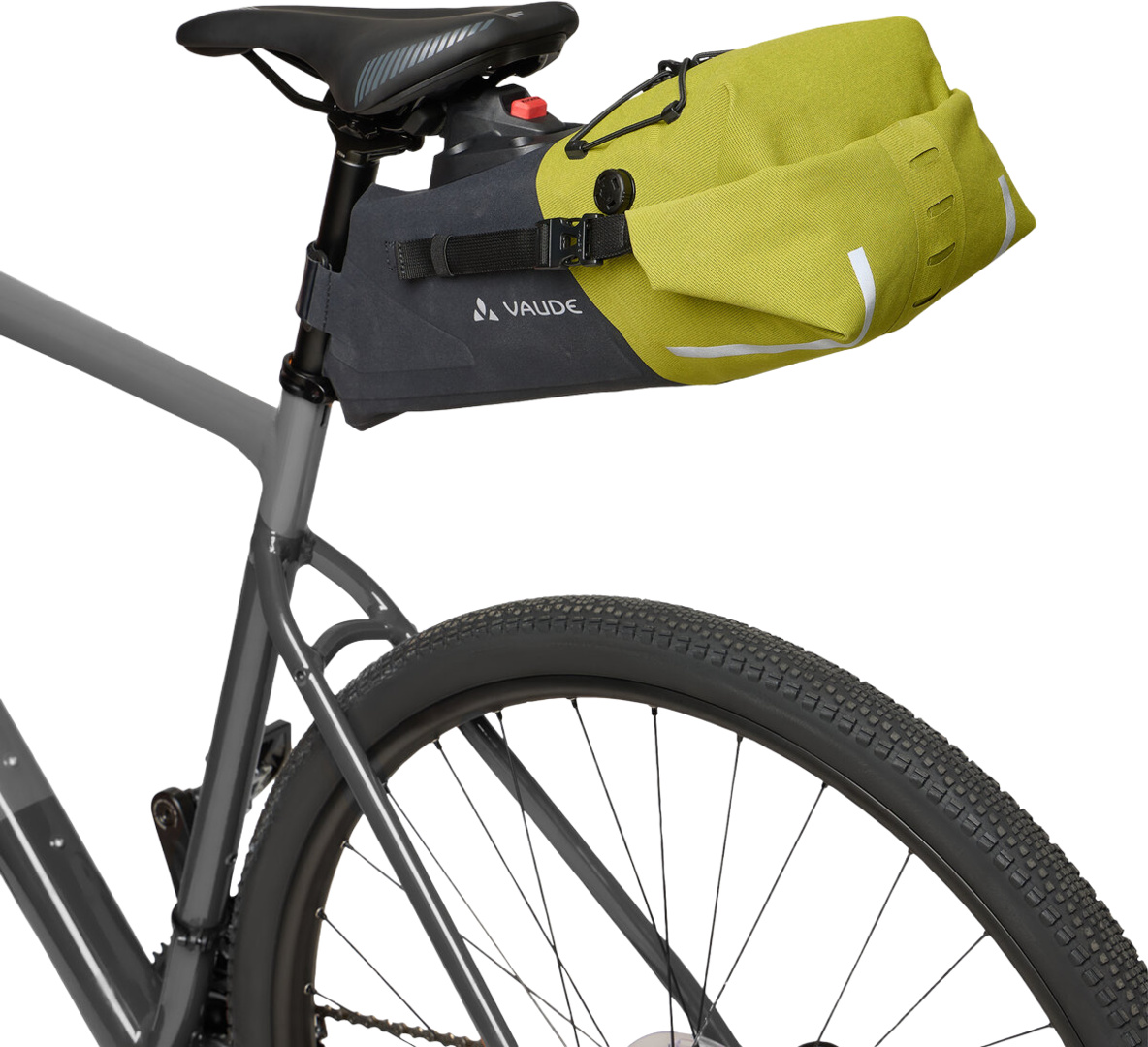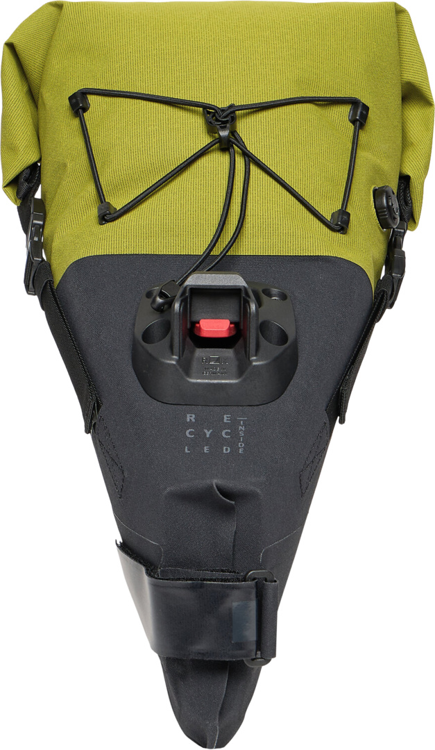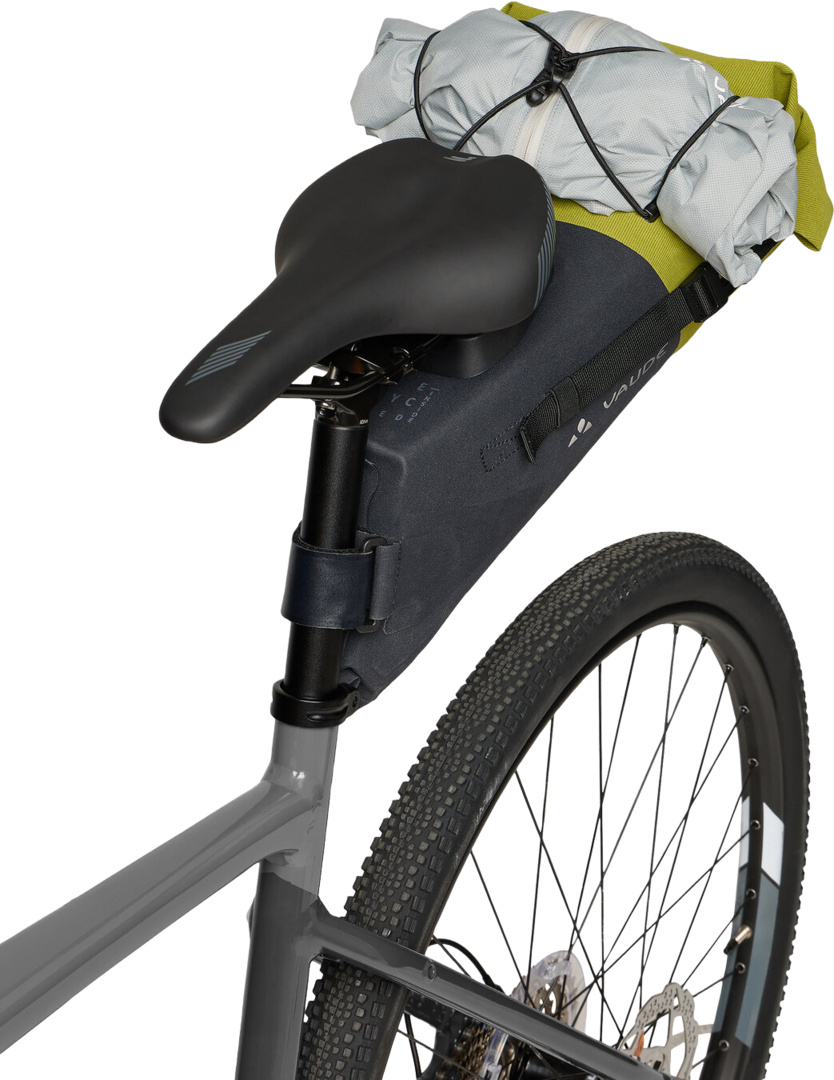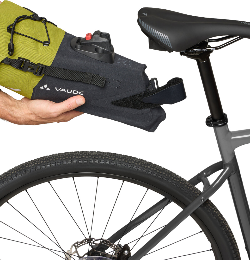 Die kompakte, wasserdicht verschweisste Fahrrad Satteltasche Trailsaddle Compact M fasst mit sechs Litern Volumen Etliches fürs Bikepacking am Wochenende. Der Wickelverschluss und das Entlüftungsventil ermöglichen eine optimale Komprimierung des Inhaltes. Der Halter des KLICKfix® Schnellverschlusses wird unter dem Sattel montiert und sorgt über den Adapter an der Satteltasche mit einem Klick für eine einfache Montage und ebenso schnelles Abnehmen. Ein stabiles Klettband sichert die Satteltasche zusätzlich am Sattelrohr. In der Kordelspinne auf der Oberseite kann schnell die Wind- oder Regenjacke verstaut werden. Die Trailsaddle Compact M kann gut mit der Trailfront Compact Lenkertasche kombiniert werden, um das kleine Wochenendgepäck vollständig – ganz ohne Gepäckträger – am Rad zu befestigen.