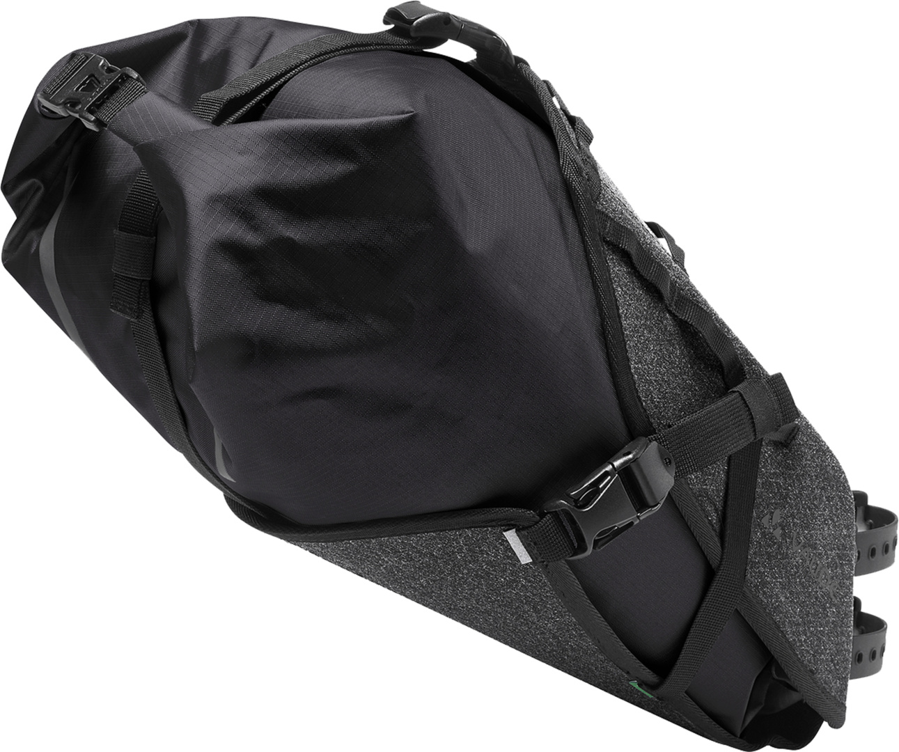 Entdecke die Abenteuerlust! Spontan mit Freunden aufbrechen, ohne zu wissen, wo es einen am Abend hin verschlägt? Mit der wasserdicht verschweissten Satteltasche aus PVC-freiem Planen-Material ist alles Nötige dabei. Der einfach zugängliche, mit Wickelverschluss wasserdichte verschliessbare Packsack mit 10 Liter Volumen eignet sich hervorragend zum Verstauen einer Grund- Ausstattung. Die Packsackhalterung ist schmal geschnitten, hält den Packsack in Form, stört nicht beim Pedalieren und dient zusätzlich auch noch als Spritzschutz. An der oberen Band-Befestigungsleiste lassen sich eine Regenjacke oder auch eine Taschenlampe für schnellen Zugriff befestigen. Die Halterung wird an der Sattelstütze befestigt und über ein durch die Sattelstreben geführtes, umgelenktes Band mit Arretierungsschnalle ruckelfrei in Position gehalten. Rückwärtige Reflexdrucke auf Packsack-Halterung und dem Packsack selbst erhöhen die Sicherheit im Dunkeln. Kombiniert mit der Trailfront für Schlafsack oder Zelt steht dem Abenteuer nichts mehr im Wege. Die Trailsaddle ist nicht nur ein praktischer Begleiter fürs Bikepacking. Sie leistet auch ganze Arbeit in Sachen Umweltschutz, denn sowohl Halter als auch Packsack bestehen zu 100 % aus recycelten Materialien.