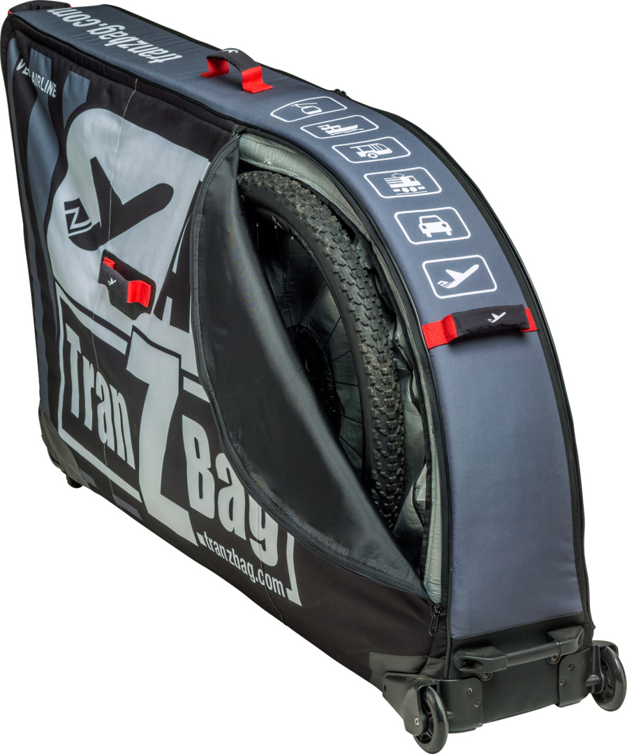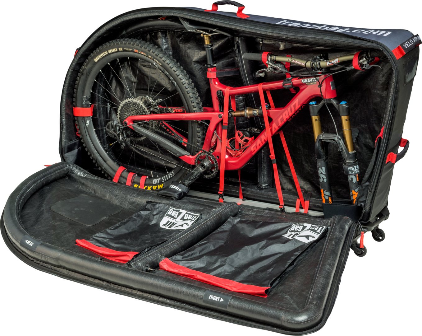 Im Tranzbag AIR sind Velos innert 10 Minuten reisefertig verpackt. Keine Hinterrad-Demontage und keine Lenker-Demontage dank Tranzbag AIR System Total Integration STI. Vier aufblasbare Luftkammern schützen das Velo während Reise und Flugtransport. Die Luftkammern werden mit einer Velopumpe befüllt. 4 Laufräder bringen hohe Rollkomfort. Lenkbare Fronträder erlauben eine komfortable Fortbewegung über grosse Distanzen und in Flughäfen. Die Rubberfront des Tranzbag AIR ermöglicht den platzsparenden Vertikal-Transport im öffentlichen Verkehr.