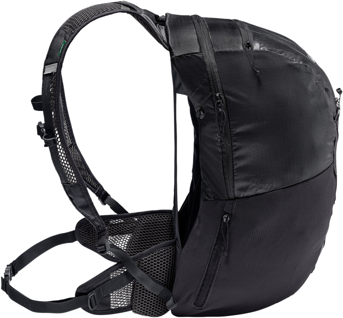 ErgoShape-Schultergurte für optimale Bewegungsfreiheit, Gurtband-Hüftgurt, leichtes, silikonisiertes Material, belüftete Schulterriemen, Front-Tasche mit Reissverschluss, 3 in 1 Kompressions-, Befestigungs- und Helmhalterungssystem , 1 Stretch-Seitentasche, seitliche Reissverschluss-Tasche, Ausgang für Trinksystem, Brustgurt mit Trinkschlauchhalter, Blinklichthalter, reflektierende Elemente